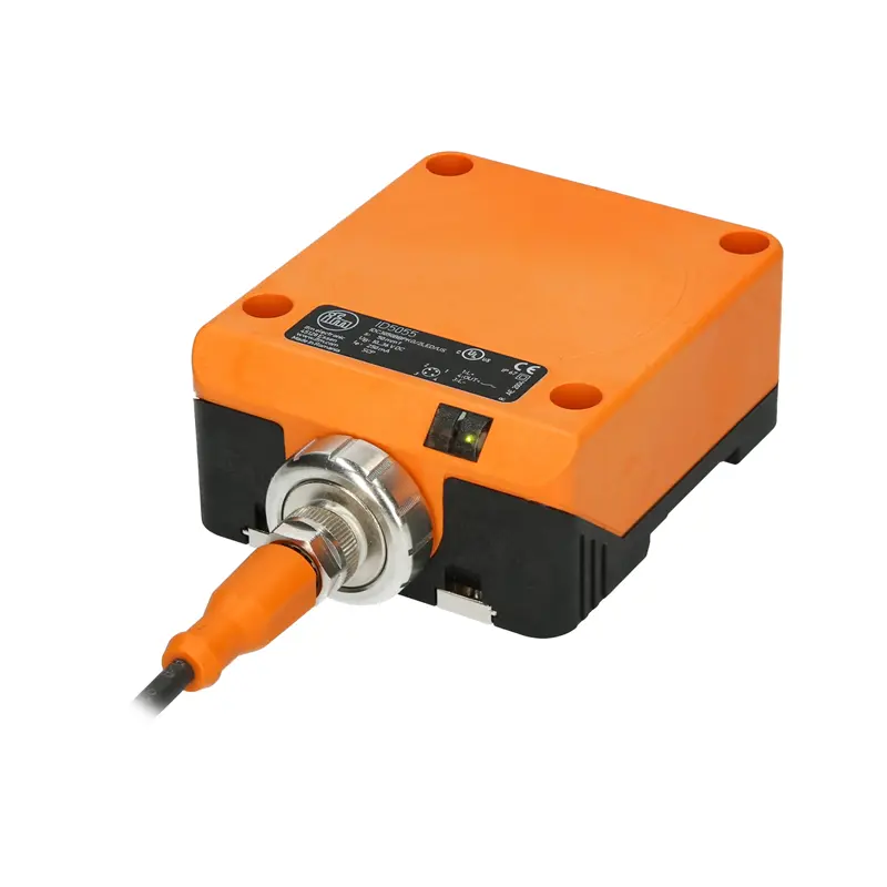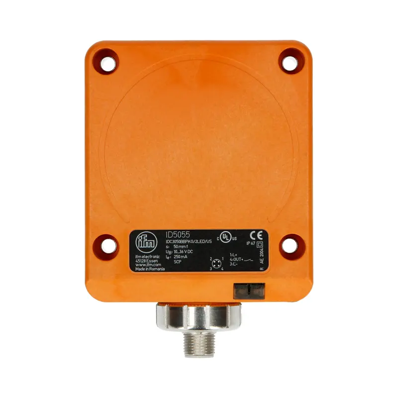 The cuboid inductive sensor ID5055 - IDC3050BBPKG/2LED/US-100-DPS from ifm electronic operates with a supply voltage of 10–36 V DC. A PNP-switching normally open contact is available as an output. Thanks to the design, the sensor is compatible with many mechanical limit switches when flush mounted and is therefore easy to replace in the event of maintenance. With a very high switching distance of 50 mm and the large active sensor surface, the sturdy ID5055 inductive sensor is the perfect proximity switch for use in harsh industrial environments.